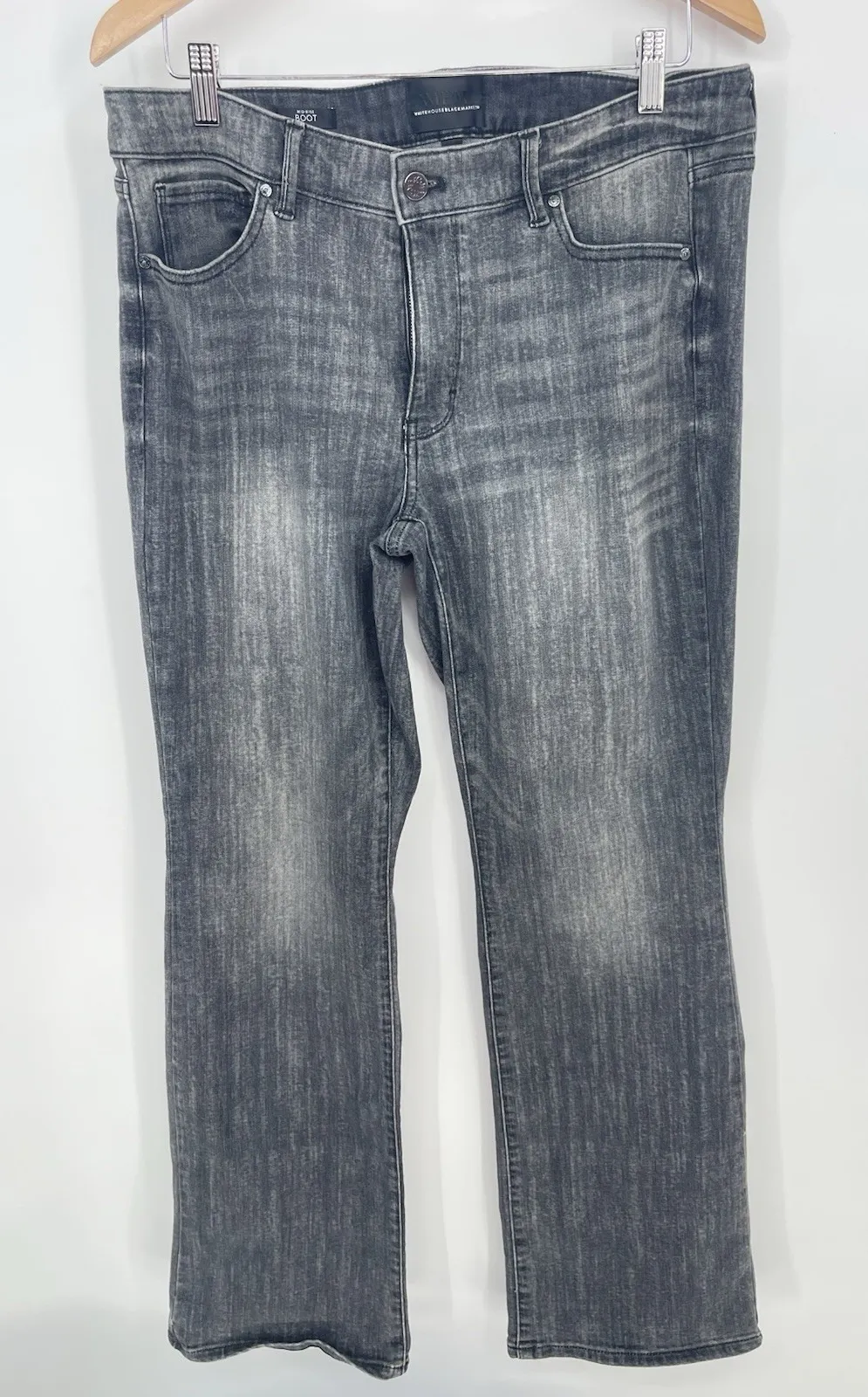 The product is a pair of WHBM The Everyday Soft Boot Jeans for women in size 12, featuring a mid-ris... Show more