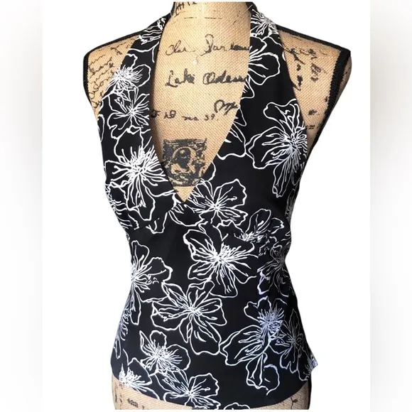 Elegant black and white floral halter top perfect for any occasion. Stylish and comfortable for a ch... Show more