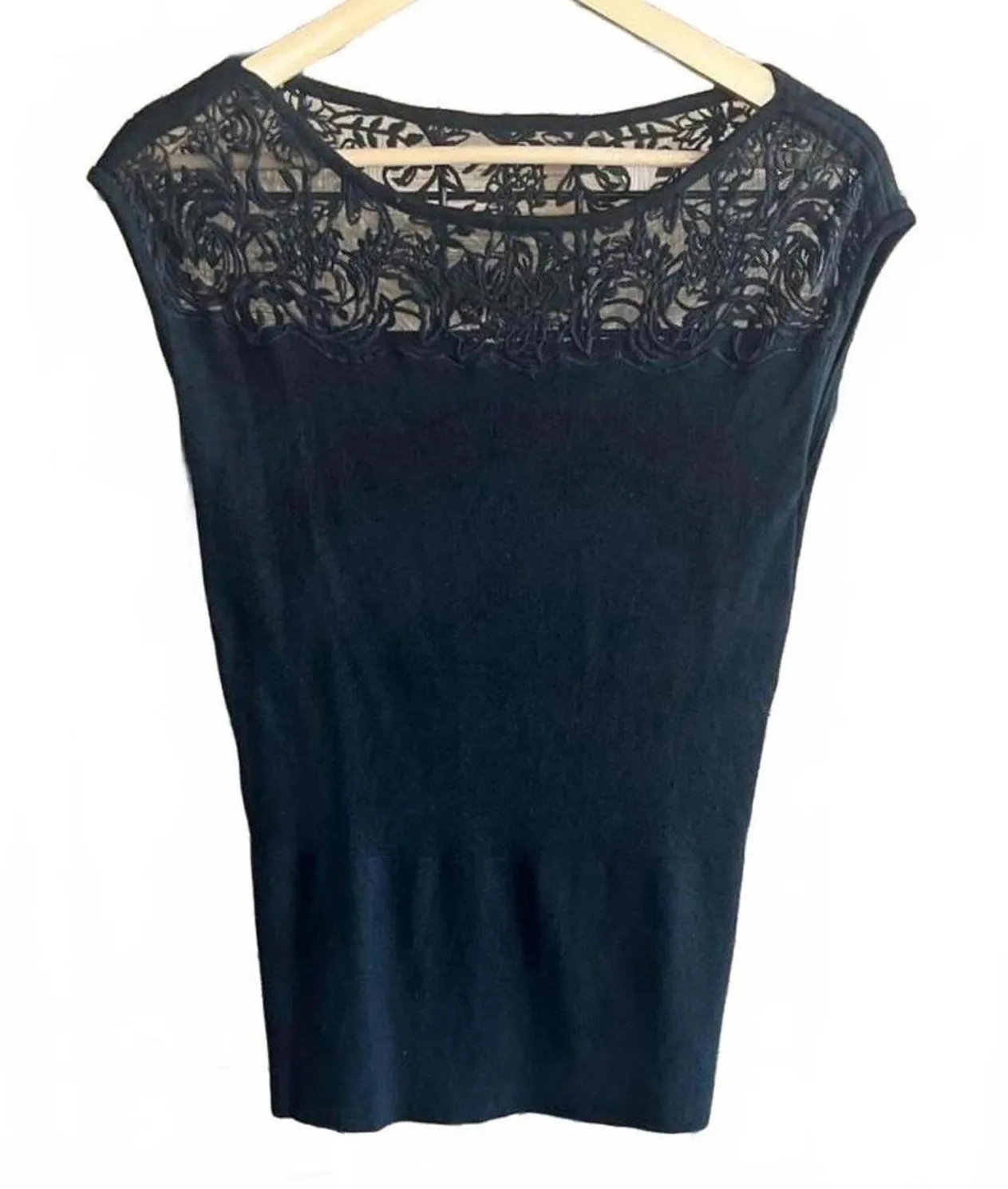 EUC WHBM Black Lace Neckline Cap Sleeves Knit Top Size Small, Round Neck Measurements Lying Flat:... Show more