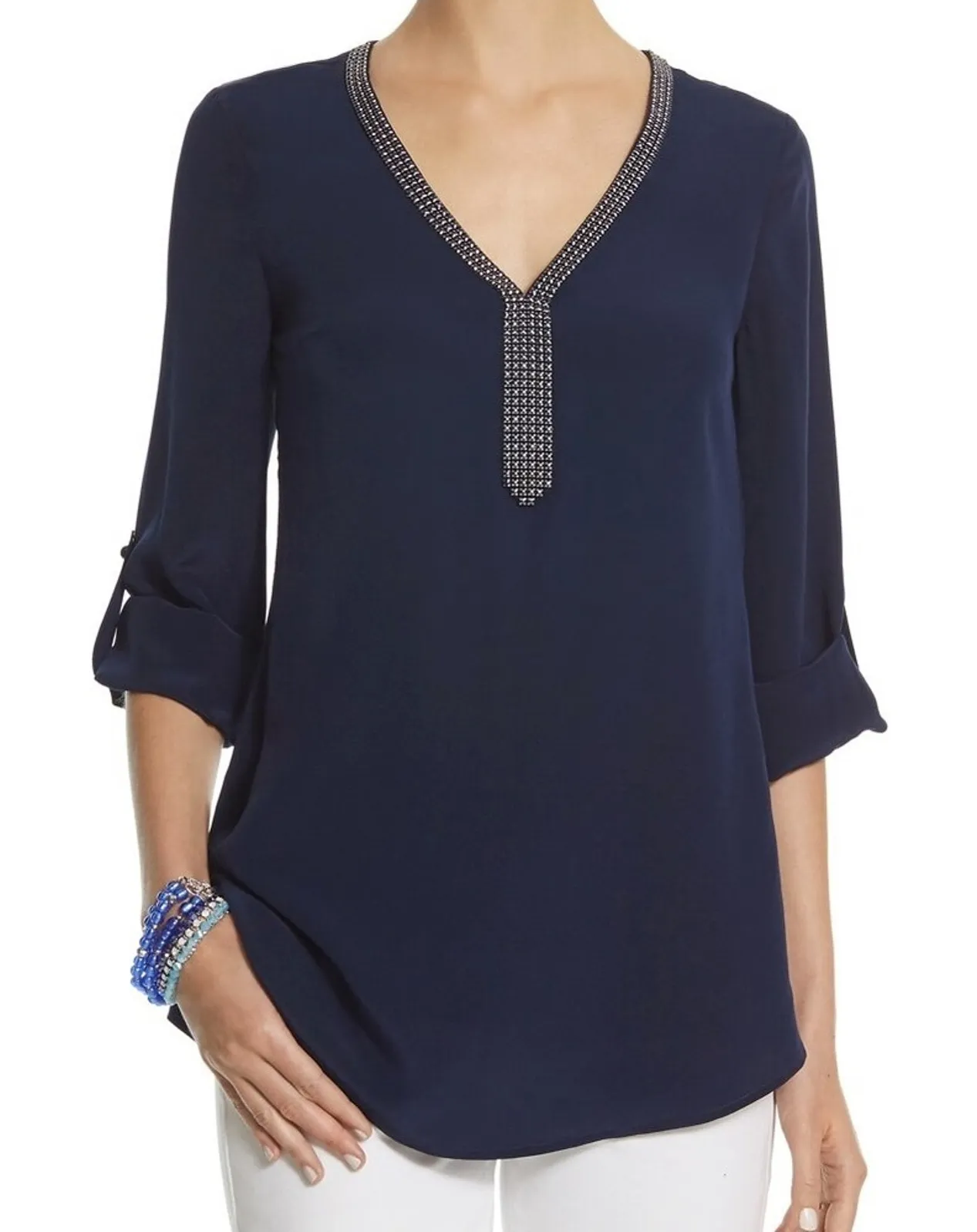 Excellent Pre-Owned Condition/ Like New Silky tunic features a y-style neckline with embellished ro... Show more