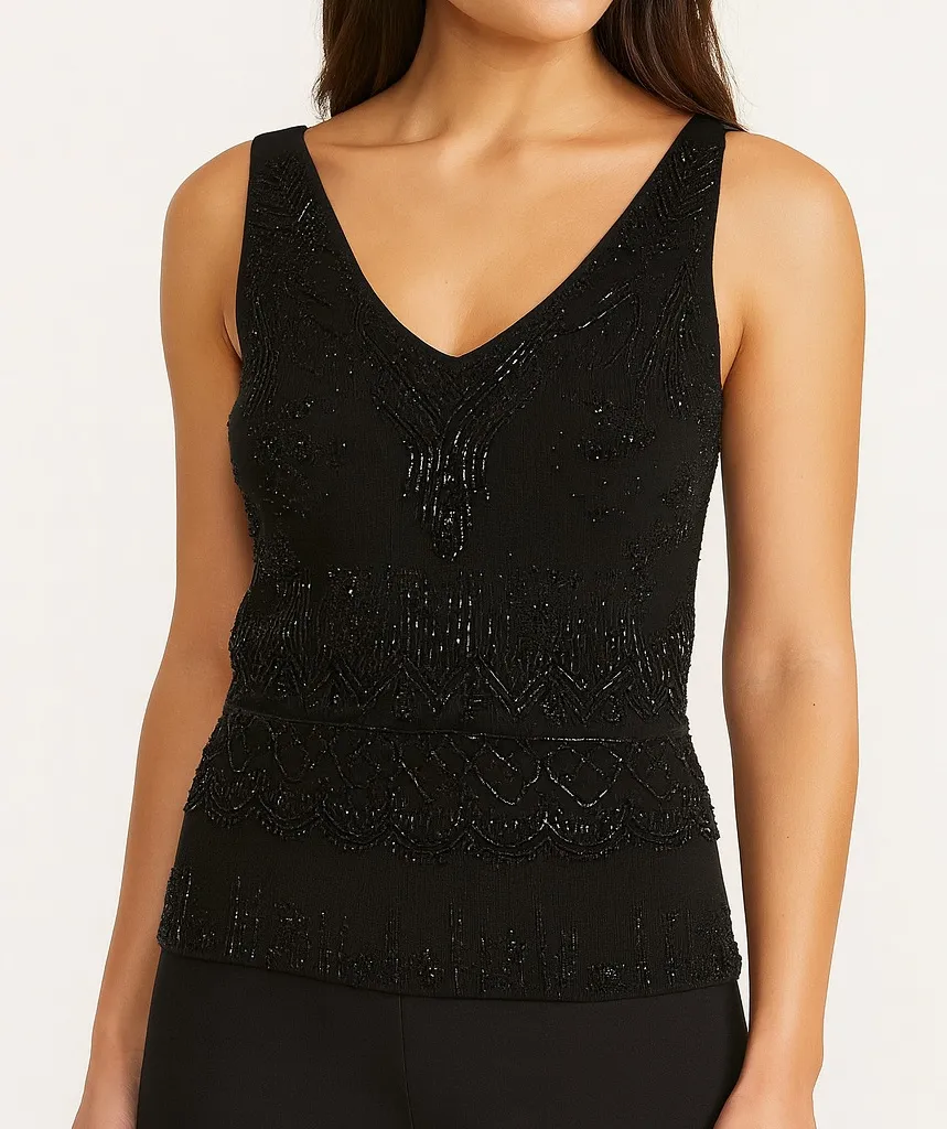 Elegant black sleeveless top with intricate beadwork. Perfect for evening wear. Please see photos o... Show more