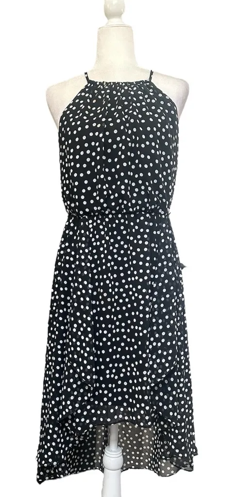 Elegant black dress with white dots. Ideal for versatile styling. High low style High neck Size 8... Show more