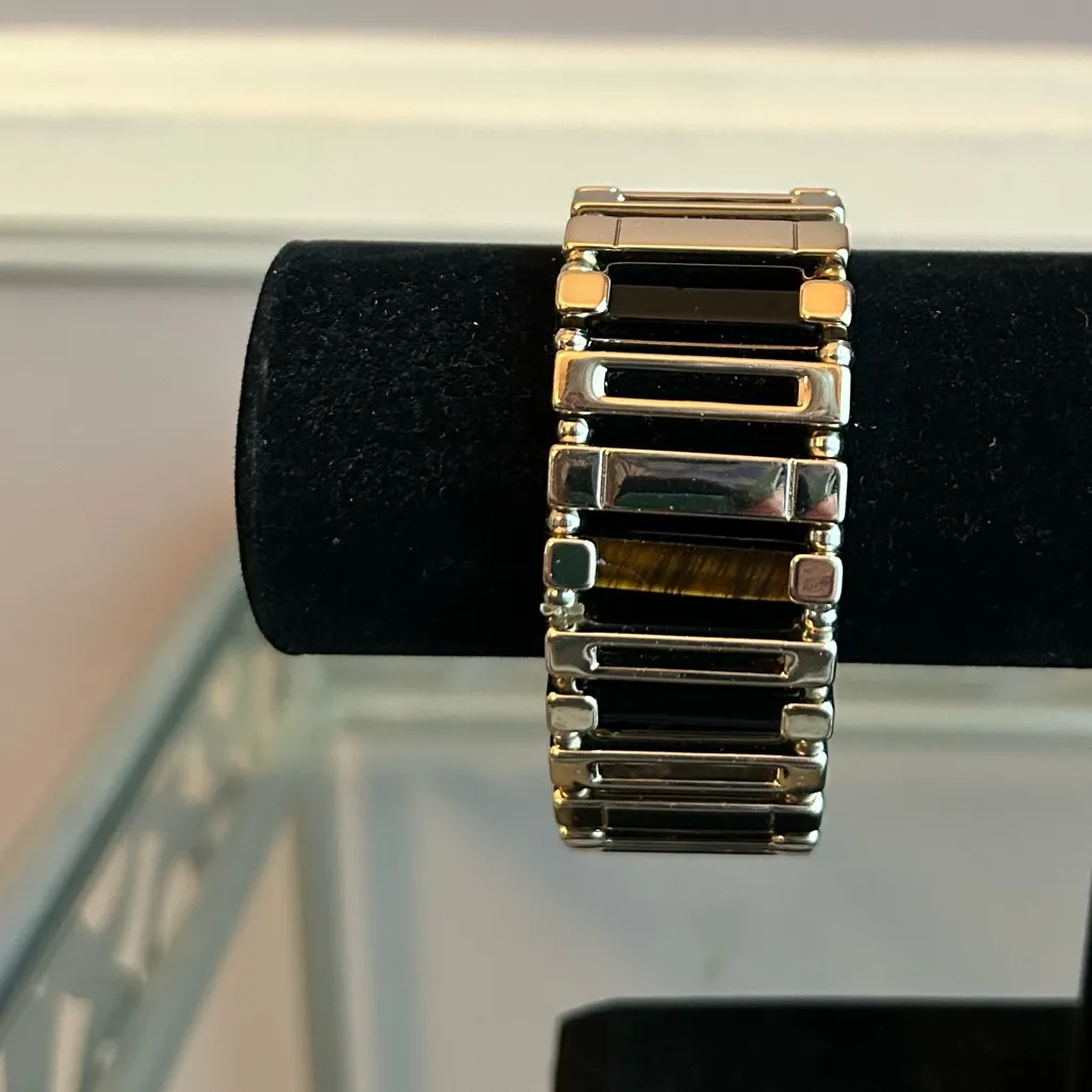 WHBM black glass and tiger eye goldtone stretch bracelet. Approximately 2.16” inner diameter. Handcr... Show more