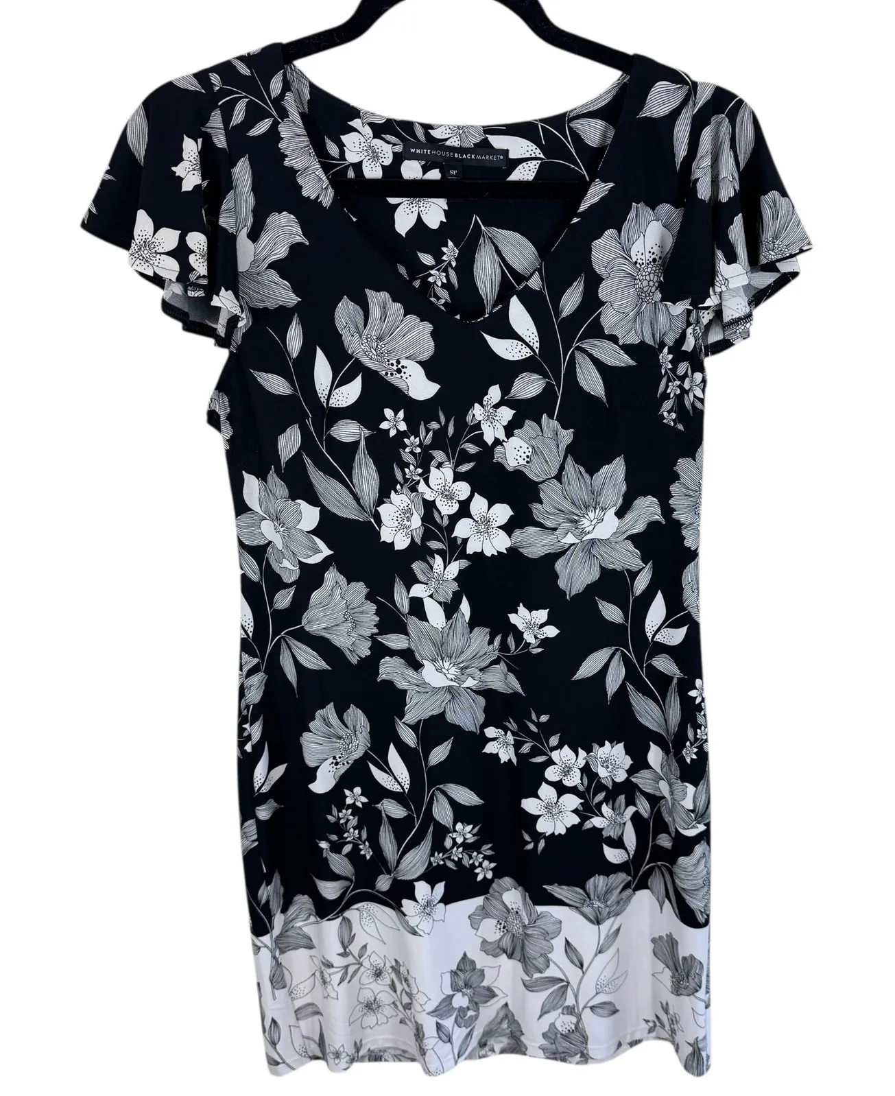 Excellent preowned condition. White House Black Market Black & White Floral Short Sleeve Stretchy Mi... Show more
