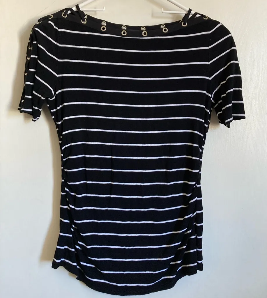 White House Black Market Black & White Striped Grommet Short Sleeve Shirt Fitted Nautical Ruched on... Show more