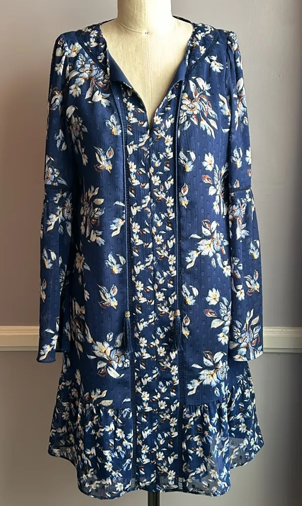 White House Black Market flowy, flirty blue floral shift dress with semi sheer bell sleeves. The dre... Show more