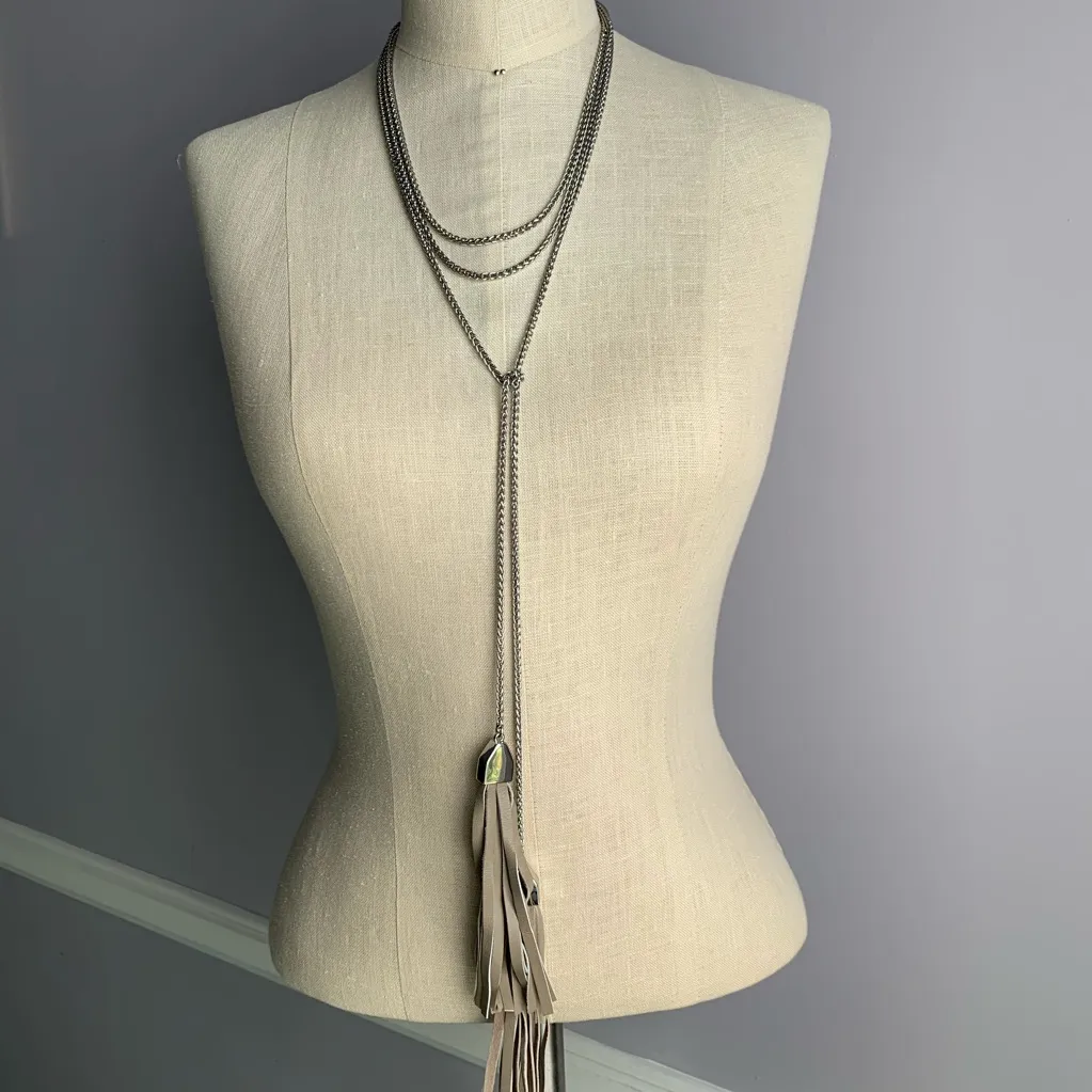 WHBM beige taupe leather tassel boho necklace. Long silvertone chain necklace with lobster clasp. Ap... Show more