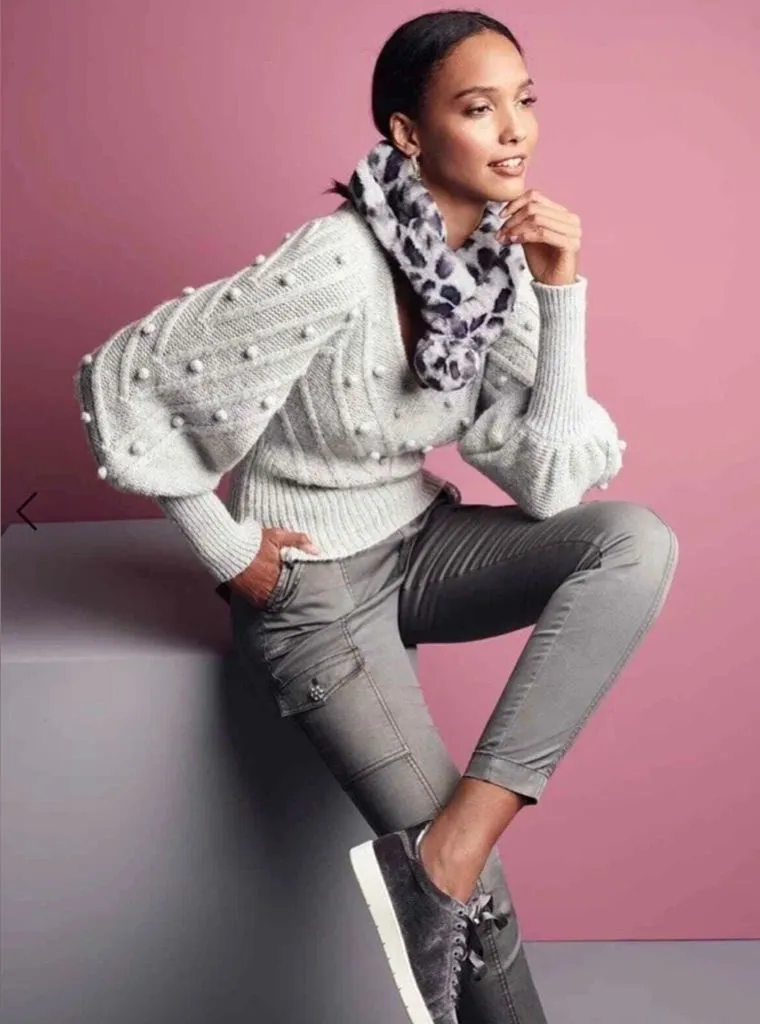 This is the White House Black Market Embroidered V-Neck Sweater With Puff Sleeves. The gray sweater... Show more