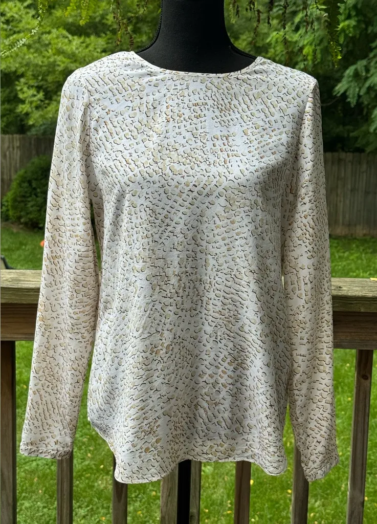 Chic blouse with cream base and gold pattern. Long sleeves and round neckline. Perfect for versatile... Show more