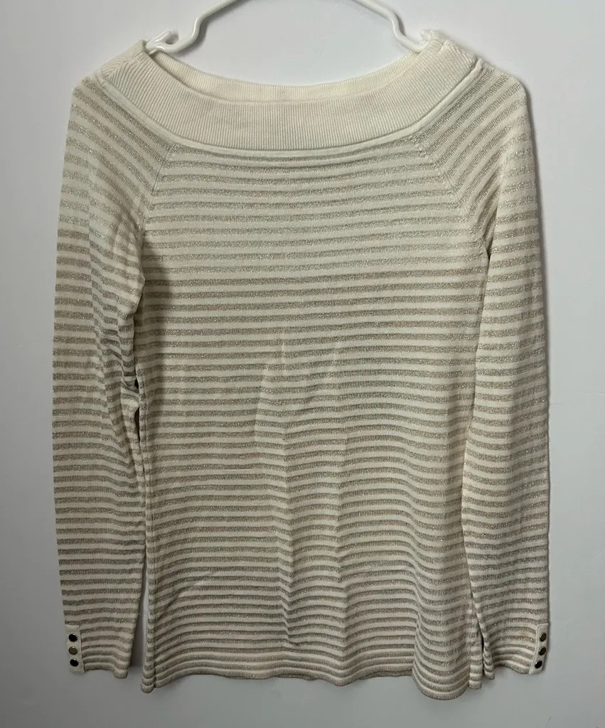 Elegant cream sweater with subtle stripes. Perfect for layering. FLAW STAIN - Small stain on slee... Show more