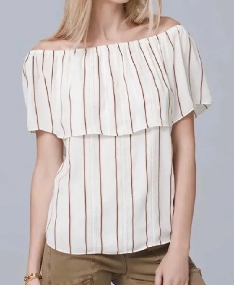 This EUC White House Black Market Cream Striped Off-Shoulder Blouse, size XS, is a timeless and femi... Show more