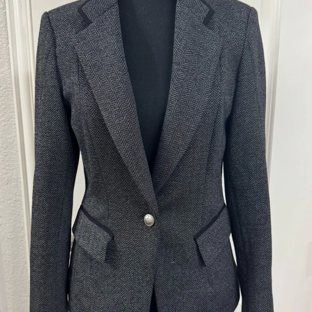 Elegant dark gray blazer with herringbone pattern. Features tailored lapels and single button closur... Show more
