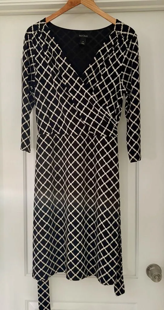 Faux wrap dress 3/4 sleeve V neck Polyester and spandex Belt included Excellent condition Very St... Show more