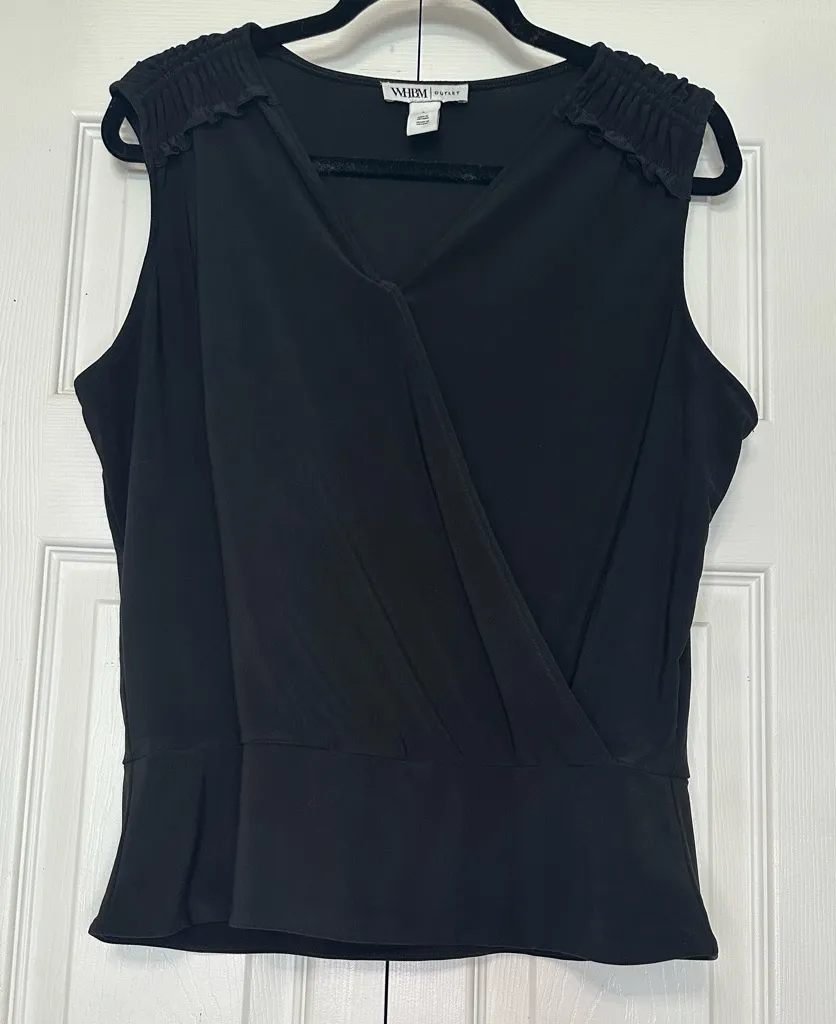 Sophisticated black sleeveless top. Features a stylish wrap design. Perfect for any occasion.