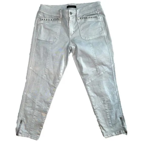 Gorgeous pair of lightest putty colored jeans with panel stitching on the legs, beaded and rhineston... Show more