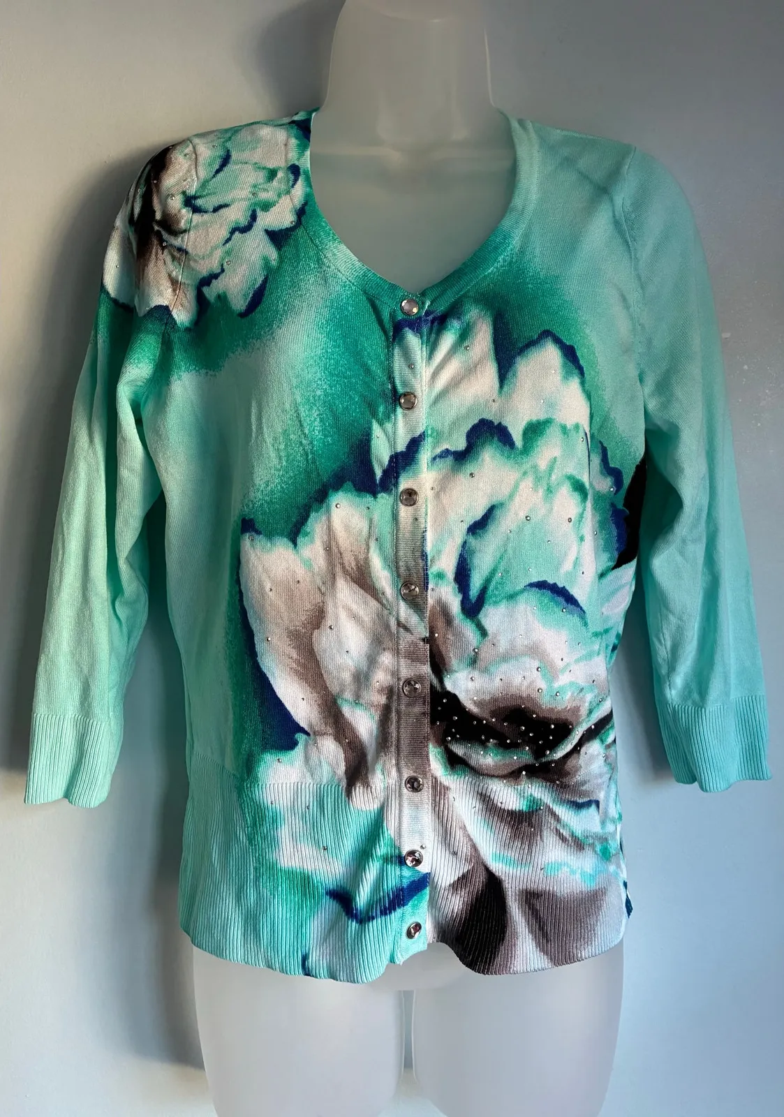 White House Black Market Blue Turquoise Floral Watercolor snap front cardigan sweater. Woman's size... Show more