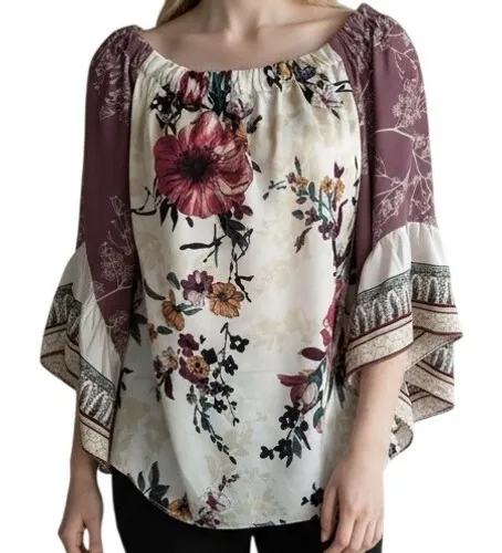 Enchanting florals bloom across this bohemian-inspired blouse, designed to effortlessly elevate your wardrobe. The romantic off-the-shoulder neckline beautifully frames the décolletage, while the flowing bell sleeves add a touch of drama and femininity. A unique colorblock design adorns the sleeves, featuring a captivating blend of solid mauve and decorative white patterns that seamlessly transition from day to night. This top offers a relaxed, comfortable fit that's perfect for embracing your free-spirited style.