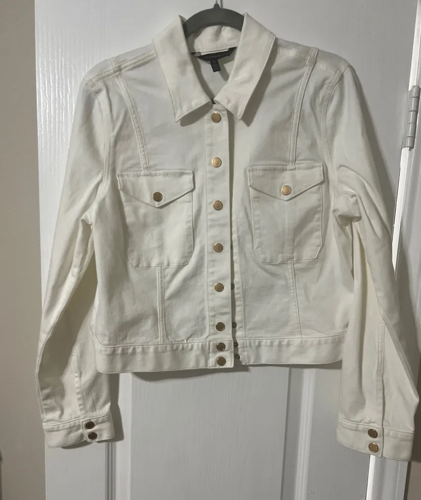 Stylish ivory jean jacket with gold button accents. Features front pockets and classic collar. Perfe... Show more