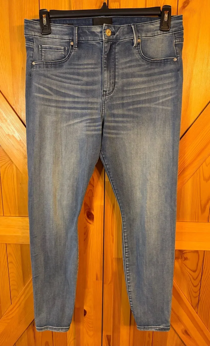 White House Black Market Jeans High Rise Denim Size Large Distressed stretchy faux front pockets mea... Show more