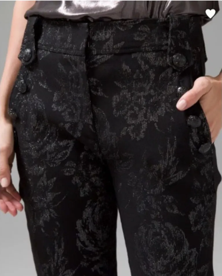 Comfortable and stylish straight leg stretchy pants by WHBM in size 8L black with metallic roses des... Show more