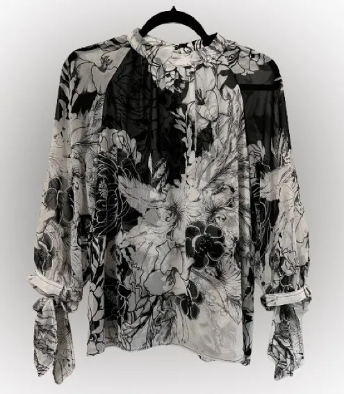 Beautiful WHBM flowy blouse with bold monochromatic floral design and tie sleeves. Features black an... Show more
