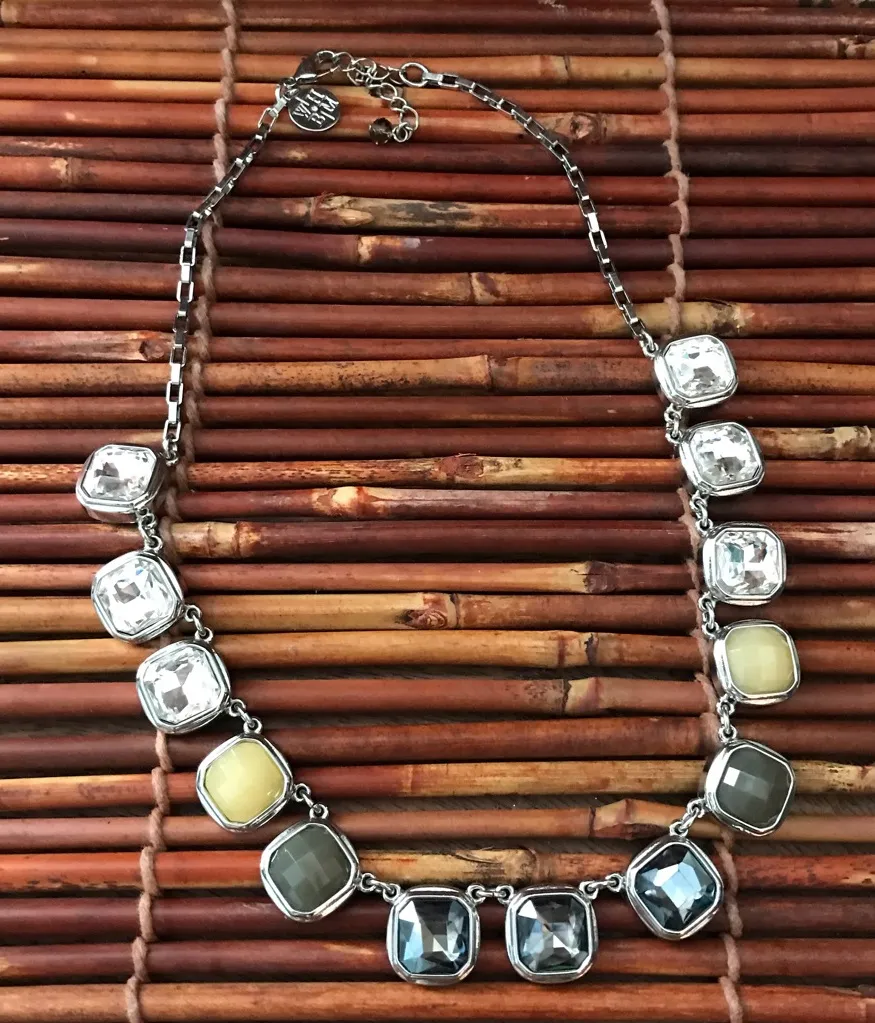 Silver Tone 18" with 2" extender. Each stone measures 1/2" square. Fashion Costume Jewelry. Sign... Show more