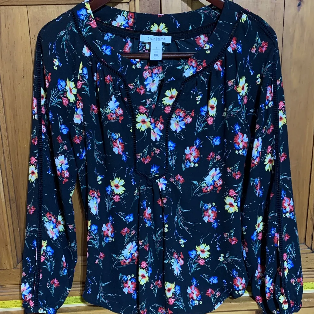 Elegant blouse with multicolor floral pattern. Features long sleeves and button details. Perfect for... Show more