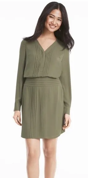 An olive green V-neck shirt dress by White House Black Market showcases meticulous pleating on the b... Show more
