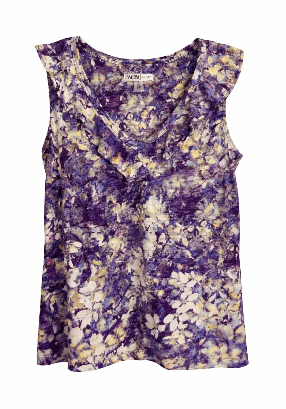 WHBM sleeveless top, White House Black Market medium, ruffle V-neck blouse, floral abstract tank, cotton viscose top, women's summer top, purple floral shirt, WHBM Outlet clothing, workwear tank.
