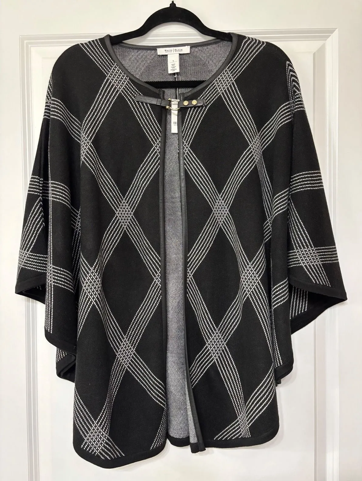 White House Black Market black and white plaid poncho-style sweater with an open front and gold hard... Show more