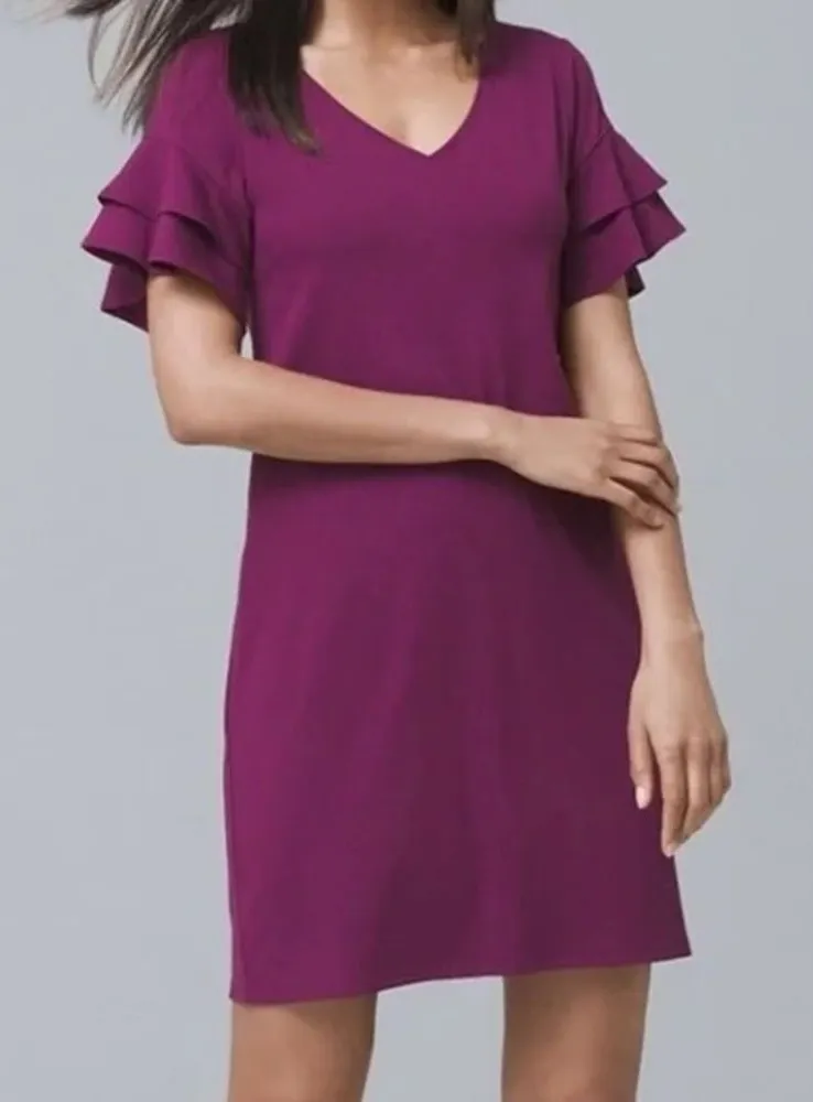 White House Black Market plum colored v-neck dress with stylish ruffle sleeve design. Ideal for vers... Show more
