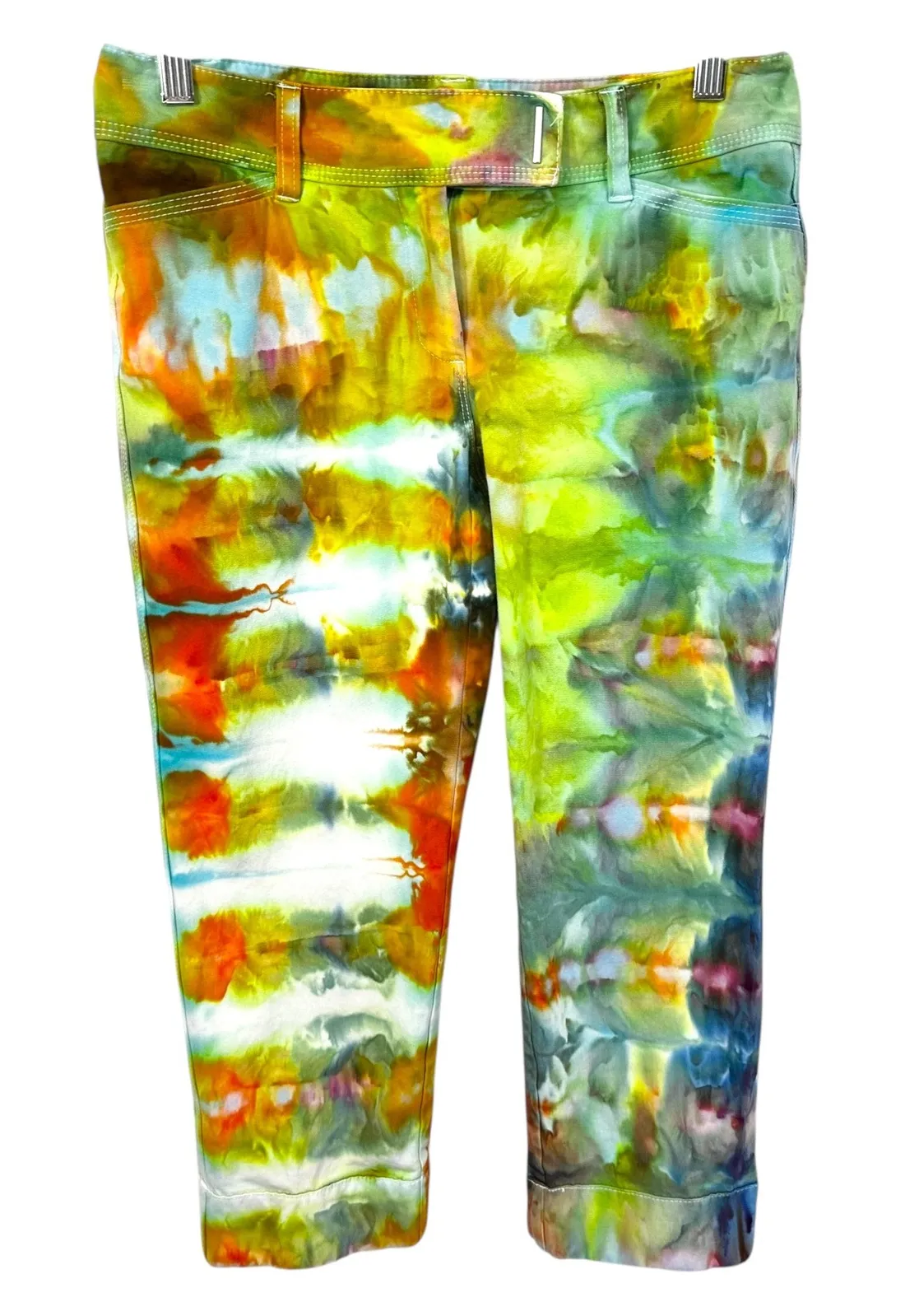 Stylish slim crop pants featuring a vibrant, eye-catching tie-dye pattern. These pants from White House Black Market offer a flattering silhouette with a comfortable fit, belt loops and a cuffed hem. The multicolor design includes shades of green, orange, yellow, and blue, creating a unique and playful look. Classic five-pocket design. Dress them up or down for a versatile addition to your wardrobe.