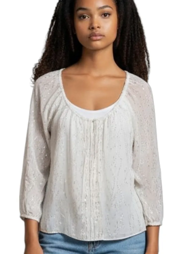 Chic cream blouse with sparkling sequins. Features a flattering scoop neckline. Ideal for elegant oc... Show more