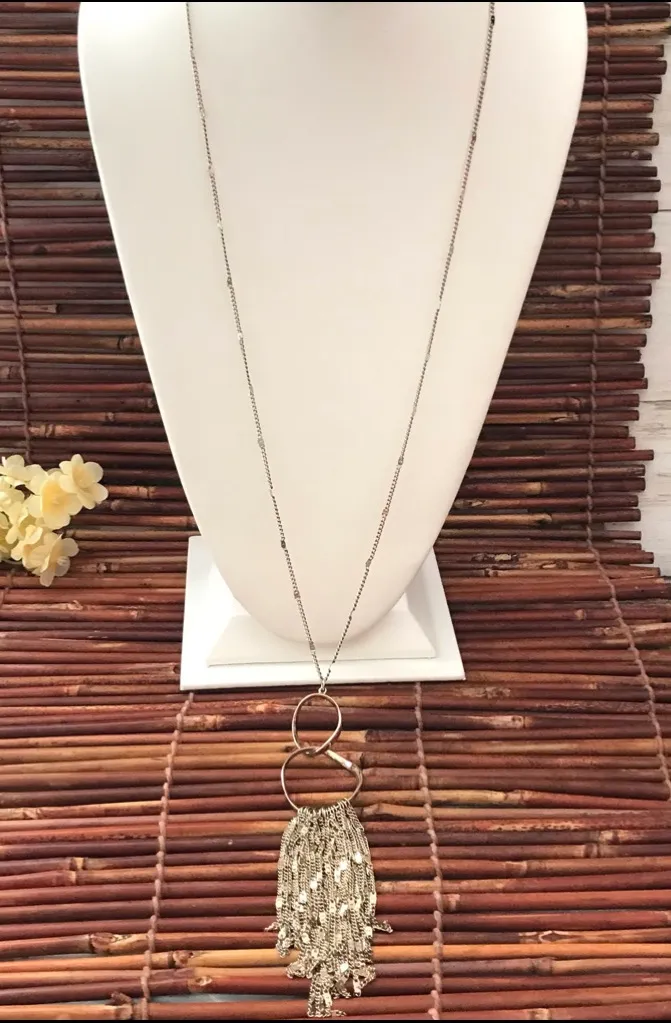 Tassel hangs from double loop 6" drop. 33" with 2" extender. Fashion Costume Jewelry. WHBM Signed/... Show more