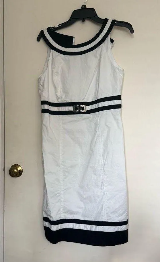 Chic mini dress with bold black trim. Features a stylish belt detail. Perfect for a modern look.