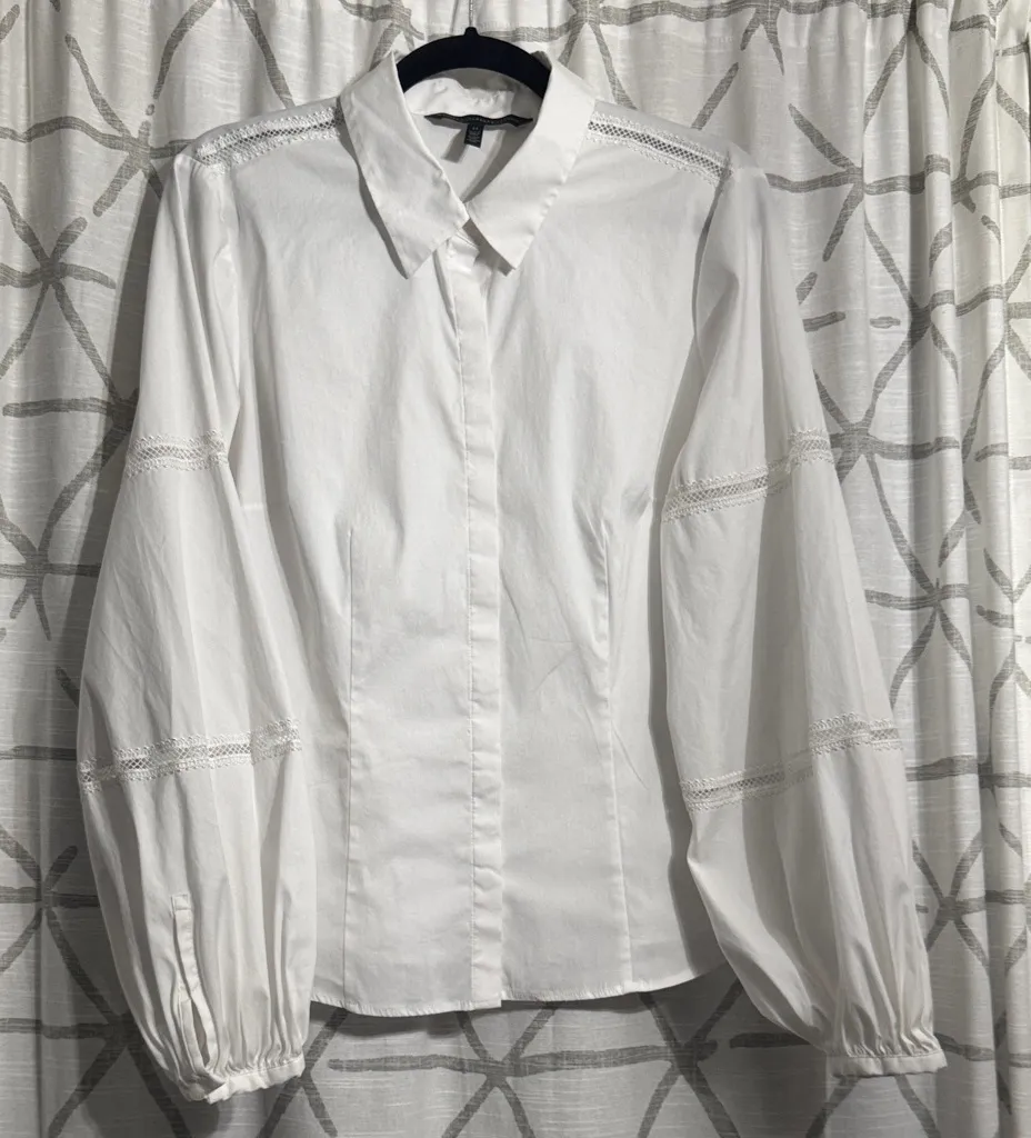 Elegant white button-down shirt. Features delicate lace detailing. Long sleeves with a classic colla... Show more