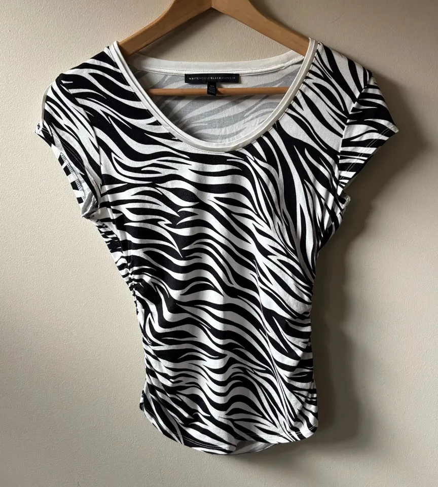 White House Black Market zebra print short sleeve top. Ruched sides make this top very flattering! S... Show more