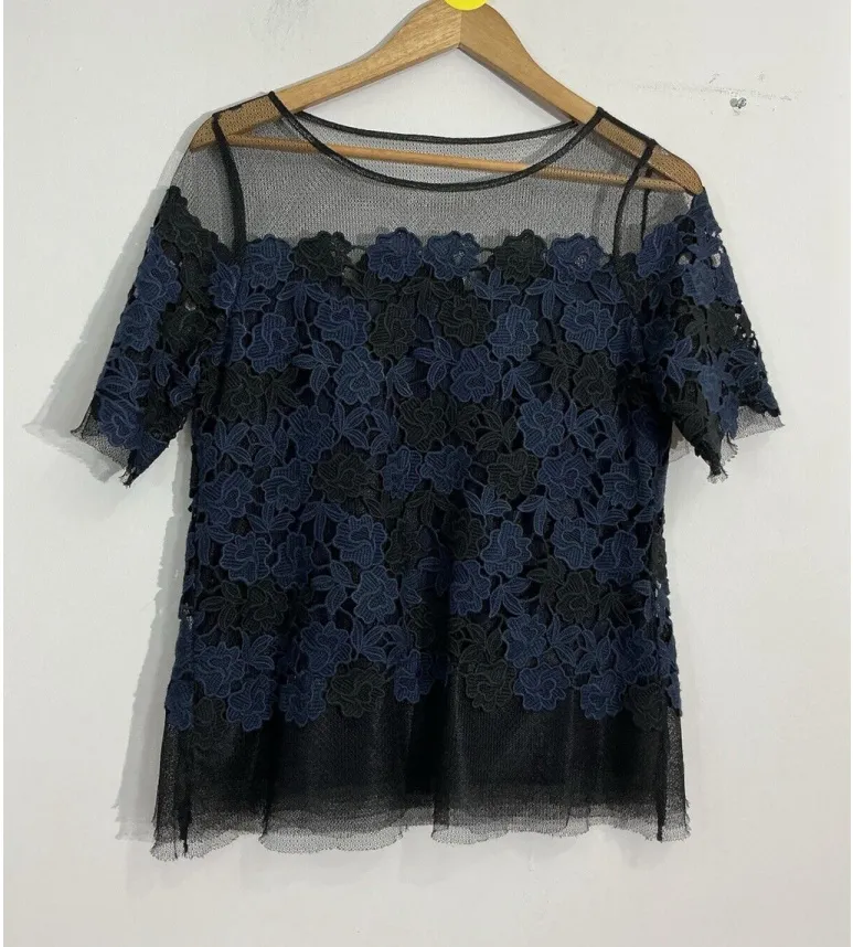 This beautiful blouse by White House Black Market features intricate lace embroidery on a blue and b... Show more