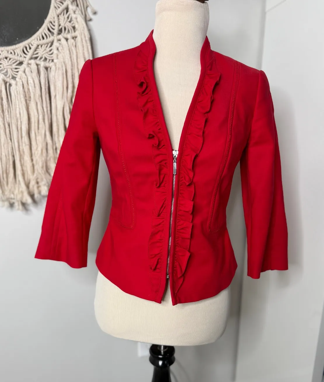 Women's WHBM White House Black Market Red Ruffle 3/4 Sleeve Zipper Cropped Jacket Blazer 4 Size: 4... Show more