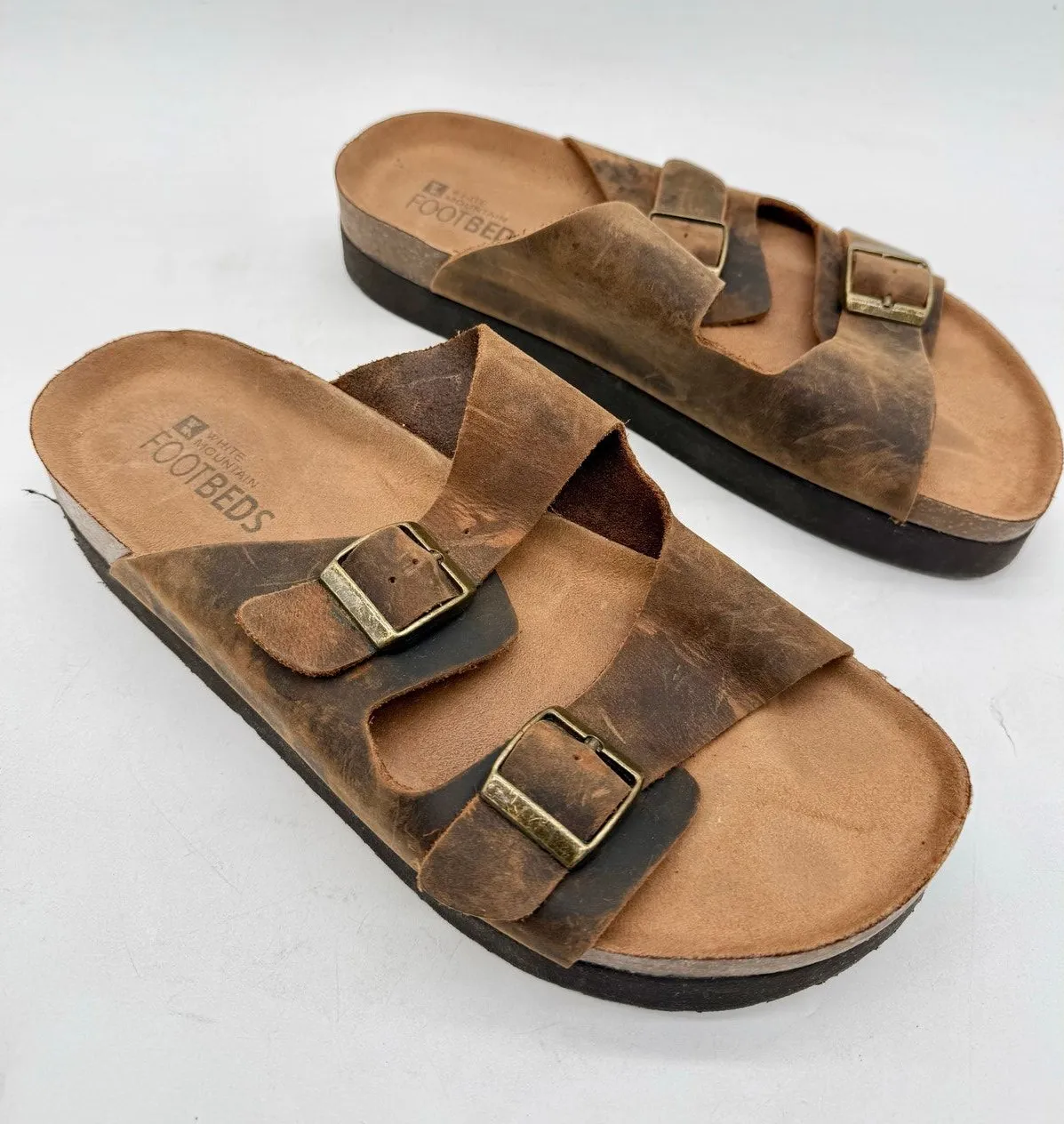 White Mountain Helga footbed sandals in distressed brown leather with adjustable buckle straps. Classic cork-style comfort footbed with a supportive molded shape — perfect for that Birkenstock-inspired casual, boho, or coastal look. Great everyday sandals for summer, travel, or laid-back outfits. Details: • Brand: White Mountain • Style: Helga • Women’s size: 10M • Color: Brown distressed leather • Double adjustable buckle straps • Contoured comfort footbed • Slip-on slide style Condition: Preowned with natural wear to the leather uppers and footbeds (adds to the lived-in look). Soles show light wear with plenty of life left. No structural damage. ⸻ boho sandals, birkenstock style, cork footbed, comfort sandals, earthy, granola girl, coastal grandma, minimalist, leather slides, summer shoes