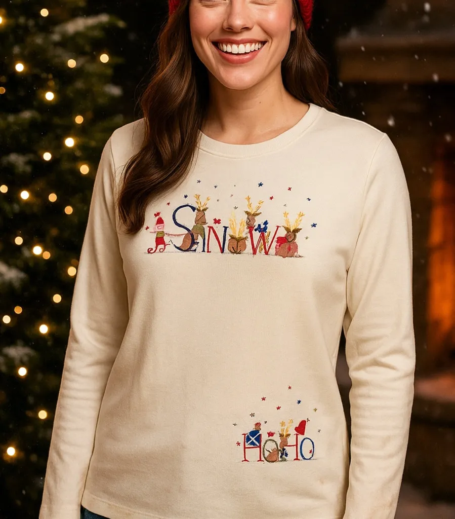 Celebrate the season in this cozy, festive long sleeve tee! This delicate ivory waffle-knit shirt features whimsical embroidery spelling out “Snow” and “Ho Ho” with reindeer, presents, candy canes, and sparkling rhinestones that make the snow shimmer. The elf hat at the top and the Santa hat at the bottom have tiny jingle bells that give a subtle holiday chime as you move. A perfect conversation starter for Christmas parties, tree-trimming, winter photos, or a casual snowy day out. • Brand: White Stag • Size: Large (L) • Color: Delicate Ivory • Material: 60% Cotton / 40% Polyester • Details: Embroidered & rhinestone “Snow” and “Ho Ho” designs, real bells on hats, long sleeves, pullover style • Condition: Pre-owned, gently worn. There is a teeny spot on the right sleeve and a teeny spot on the back, both smaller than a pencil eraser and shown clearly in the pictures. Ships quickly from a smoke-free home. #WinterWhite #CozyChic #HolidayStyle #HolidayTop #ChristmasOutfit #ChristmasMorning #CottagecoreChristmas #HolidayCore #TreeTrimmingOutfit #ChristmasPartyTop #FestiveFit #UglySweaterParty #FallOutfitInspo #FallOutfit #FallStyle #WeekendWear #WeekendStyle #VacationReady #Vacation #Resort #EffortlessOutfits #CasualStyle #CasualFriday #CasualCool #ClassicWardrobe #ClassicWorkwear #TimelessStyle #Layering #LightweightCotton #RomanticTop #RomanticFloral #RomanticChic #Romantic #PreppyStyle #Preppy #SoftGirl #OOTD #TrendyStyle #WardrobeStaple #SlowFashion #VintageInspired