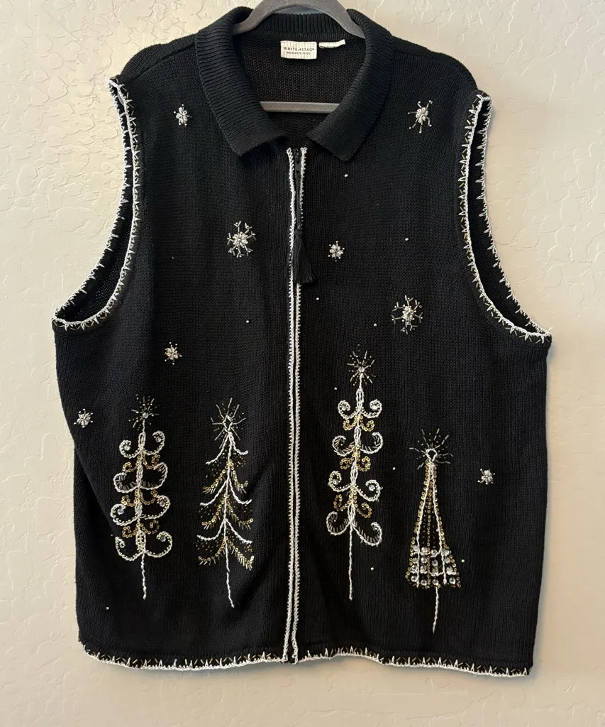 White Stag vintage women's black embroidered Christmas tree sweater vest Black with silver and gold embroidered bead and sequin Christmas tree and snowflake details Silver thread and bead detail around hem and sleeves Tassel zipper closure **can ship same or next day!** Approximate size: 22W 24W Size tag is missing so please see lay flat measurements: Armpit to armpit 26 inches across Shoulder to hem 30 inches No issues besides missing size tag Cottage core, Christmas, holiday