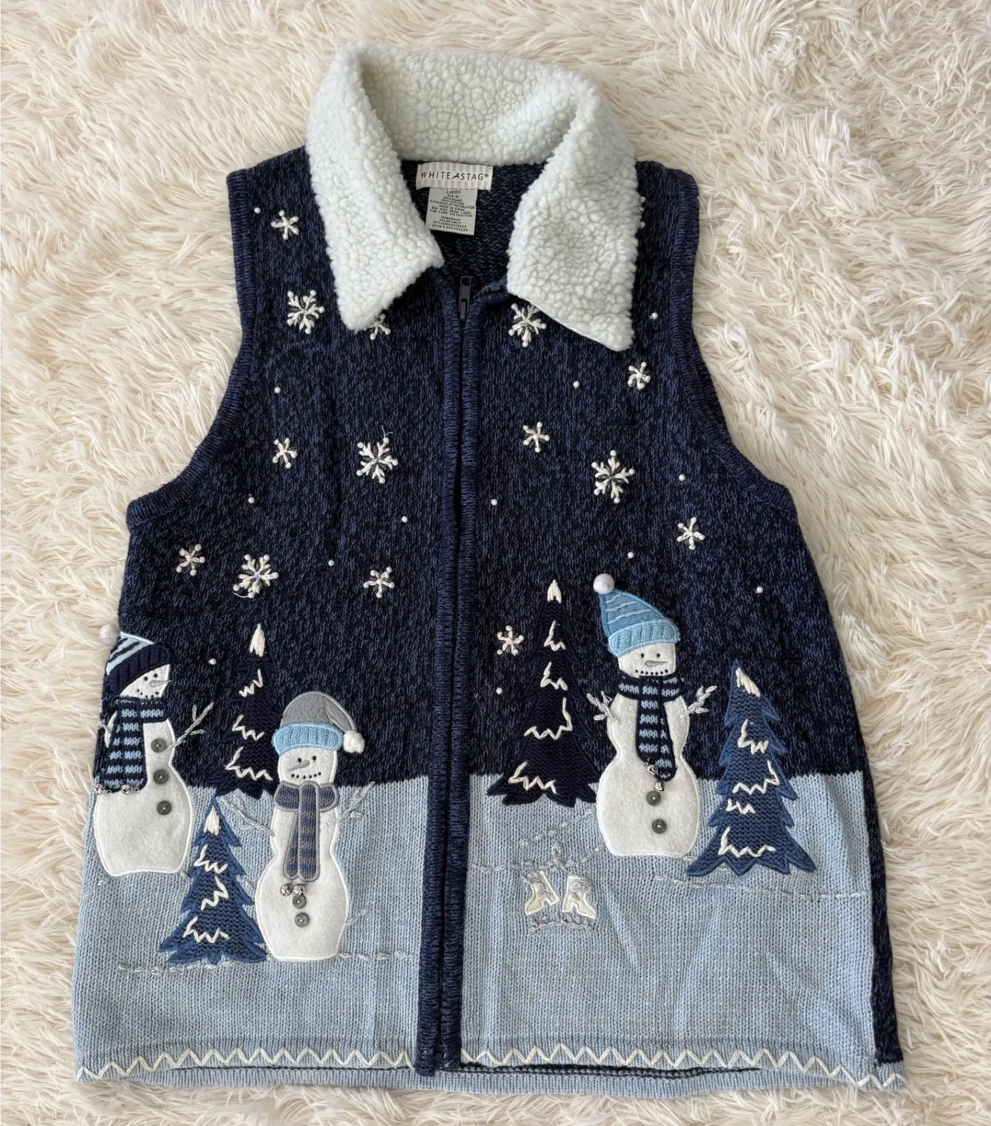 Stroll through a winter wonderland in this charming White Stag sweater vest. This navy-blue knit vest features an adorable snowman and Christmas tree motif, complete with delicate snowflake embellishments. A cozy, sherpa-style fleece collar adds warmth and a touch of whimsy. The full zip closure makes it easy to layer over your favorite long-sleeved shirts. Imagine wearing this to your next holiday gathering, a festive ice-skating outing, or while enjoying a cup of cocoa by the fireplace, bringing a touch of holiday cheer wherever you go. Measurements: • Length: 22 inches • Width (Pit to Pit): 19 inches Echristmas Type: Vest Outer Shell Material: Ramie Blend Style: Basic Jacket Department: Women Color: Blue Lining Material: Acrylic Fabric Type: Knit Features: Fleece Collar, Christmas Aesthetic, Snowflake Embellishment, Novelty Fashion, Holiday Style Accents: Embroidered Pattern: Fair Isle Insulation Material: Polyester Keywords: Christmas vest, snowman sweater vest, holiday vest, winter vest, novelty vest, fleece collar vest, White Stag vest, ladies vest, womens vest, holiday sweater, Christmas sweater, winter clothing, navy blue vest, seasonal vest, S