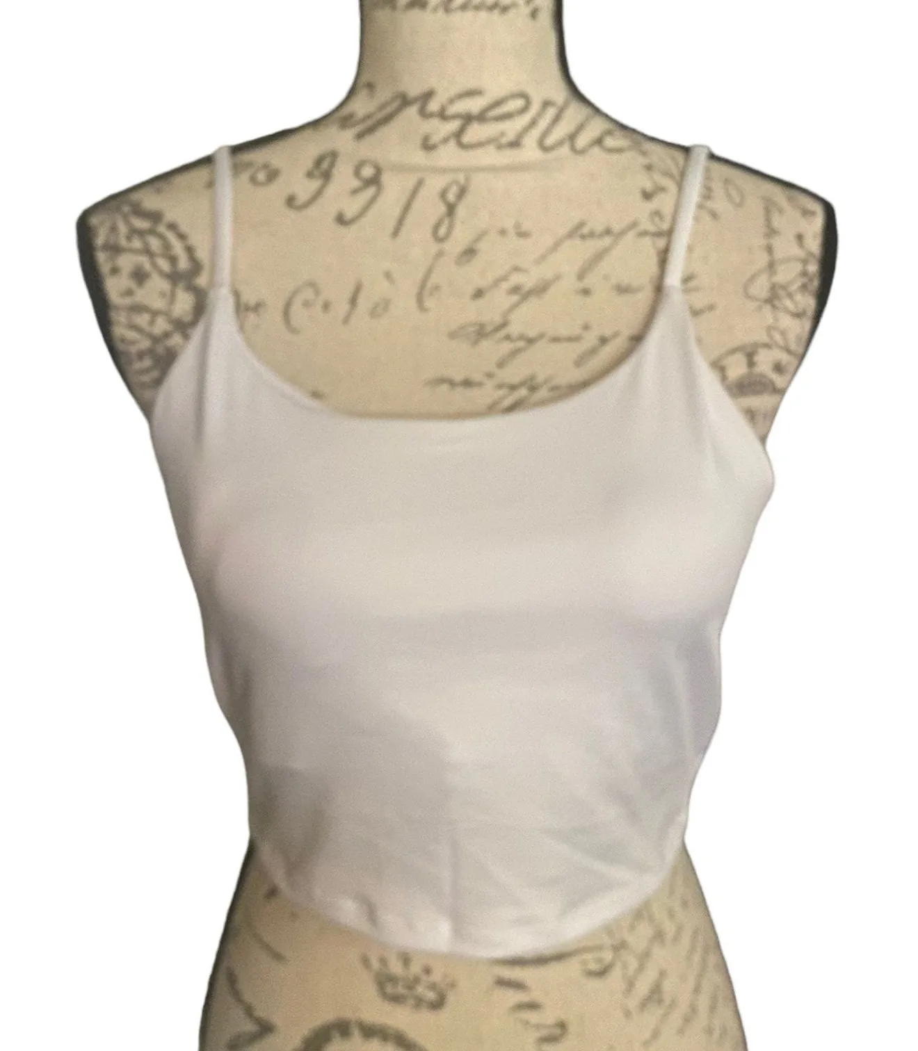 * Brand new * White yoga bra * Size large * Tank style bra * Pullover * Built in shelf bra * Straps are not adjustable * Removable padding * Nice stretch * Brand new but no tags attached * 82% Nylon 16% Spandex