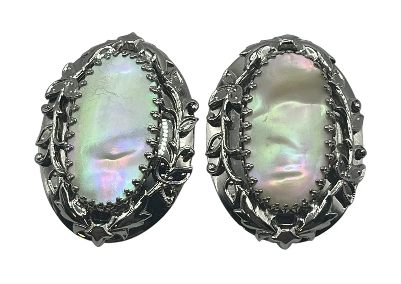 Whiting & Davis Co. VTG Clip On Earrings Faux Mother of Pearl Oval Vine Frame Preowned/gently used Ships fast! Ships from a smoke free pet friendly home Keywords: Whiting & Davis, vintage earrings, clip on earrings, faux mother of pearl, oval earrings, silver tone earrings, floral earrings, costume jewelry, statement earrings, retro jewelry, classic earrings, Whiting and Davis