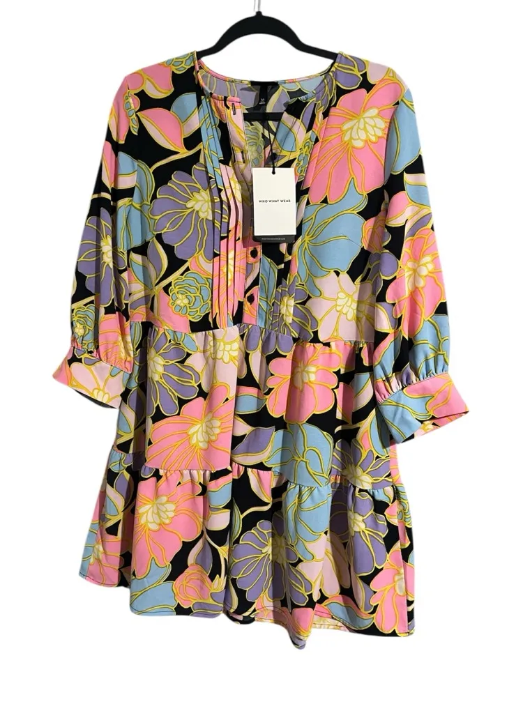Size medium Bright floral with pink, blue, and yellow. Eye-catching and stylish. 3/4 Sleeve Floral... Show more