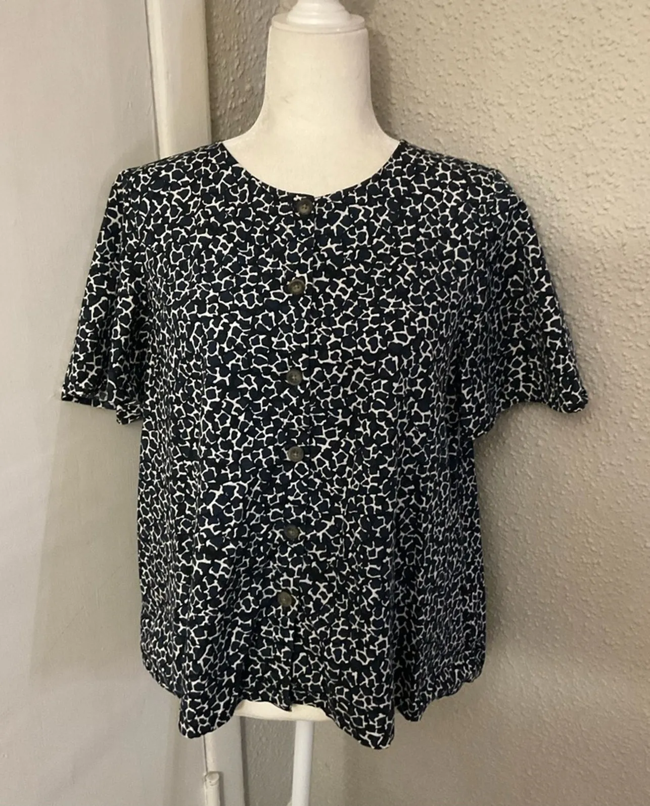 Style: Short sleeve crewneck blouse with all over print Color: Navy/Black/White Size: M Armpit: 21"... Show more