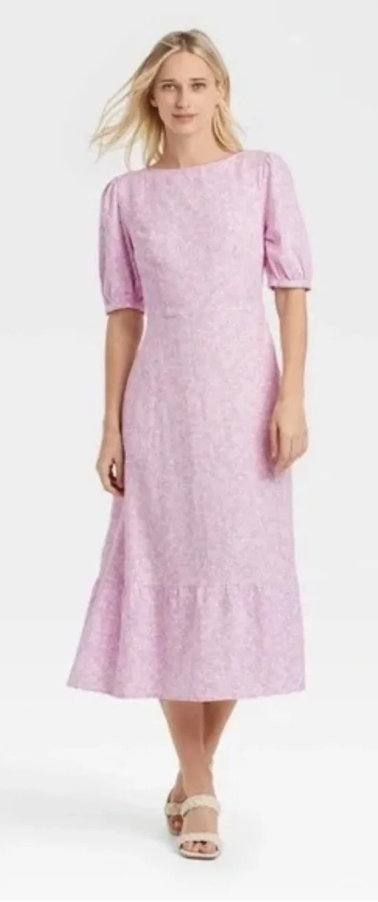 A charming midi dress in a delightful lilac floral print. This dress showcases elegant puff short sl... Show more