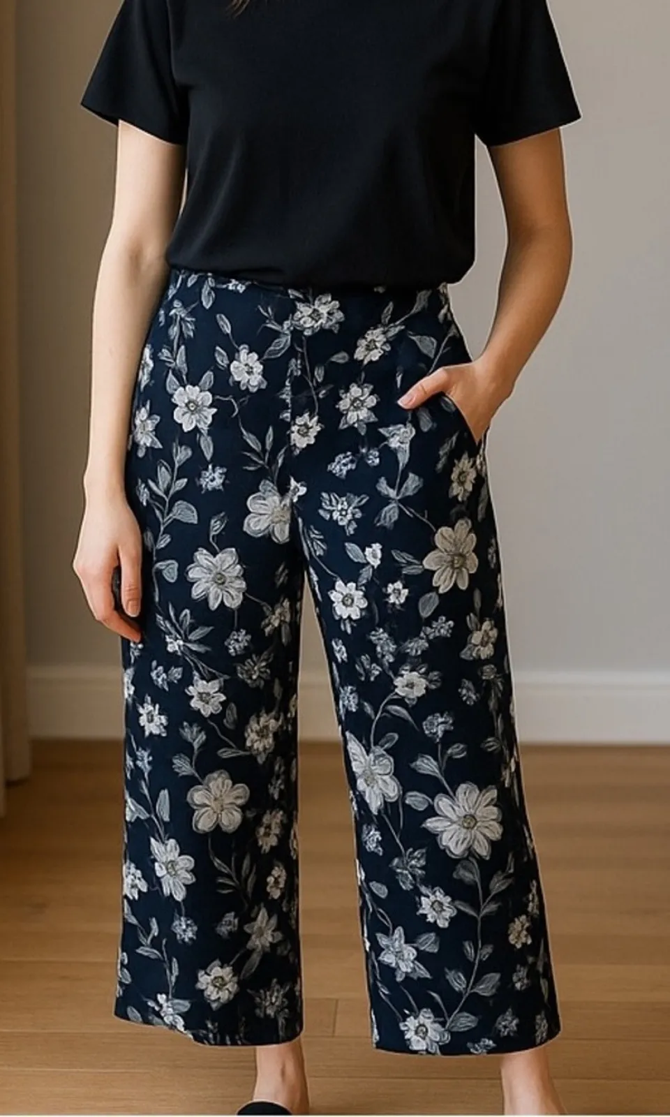 These wide-leg pants feature a sophisticated floral print, ideal for professional or semi-formal set... Show more