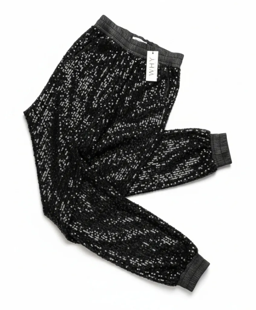 New Years Eve ready! Brand new with tags WHY Dress black sequin joggers in size small. Comfortable elastic waist meets all-over sparkle - party without the pain. Perfect for NYE celebrations, holiday parties, or any time you want to shine. Dress up with heels and a bodysuit or keep it cozy with a crop top and sneakers. Never worn, all sequins intact, no flaws. Elastic waist fits 24-32", inseam 28", jogger cuff at ankle. Ships SAME DAY for your New Years plans!